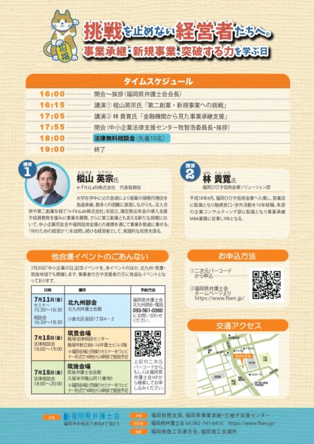 2025.7.4 〖日時〗2025年7月18日(金)16:00~19:00 〖場所〗福岡市天神1丁目6-8 福岡信用金庫本社ツインビル14階会議室 16時~法律無料相談会(先着10名)を実施される予定です。興味がある方はぜひお申込みください。