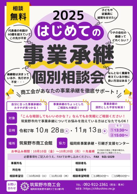 事業承継を考えている方、どのように進めたら良いのか分からない方、その他事業承継に関する相談をしたい方はぜひ個別相談会をご利用ください(相談無料・完全予約制)。